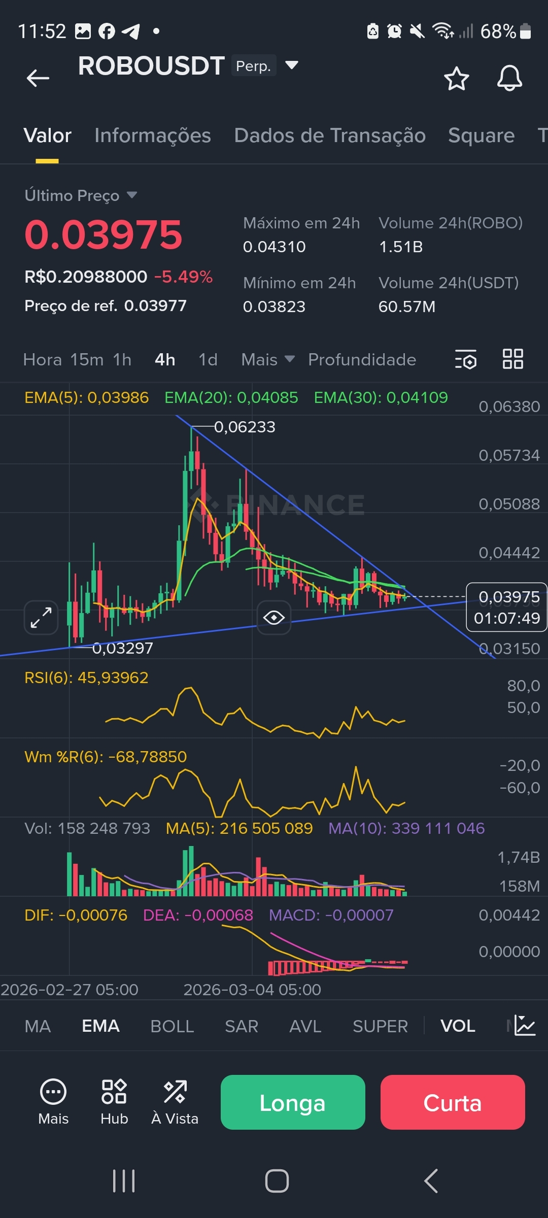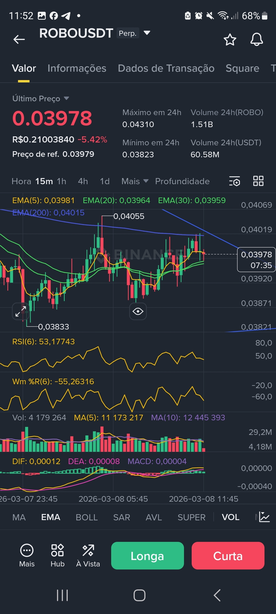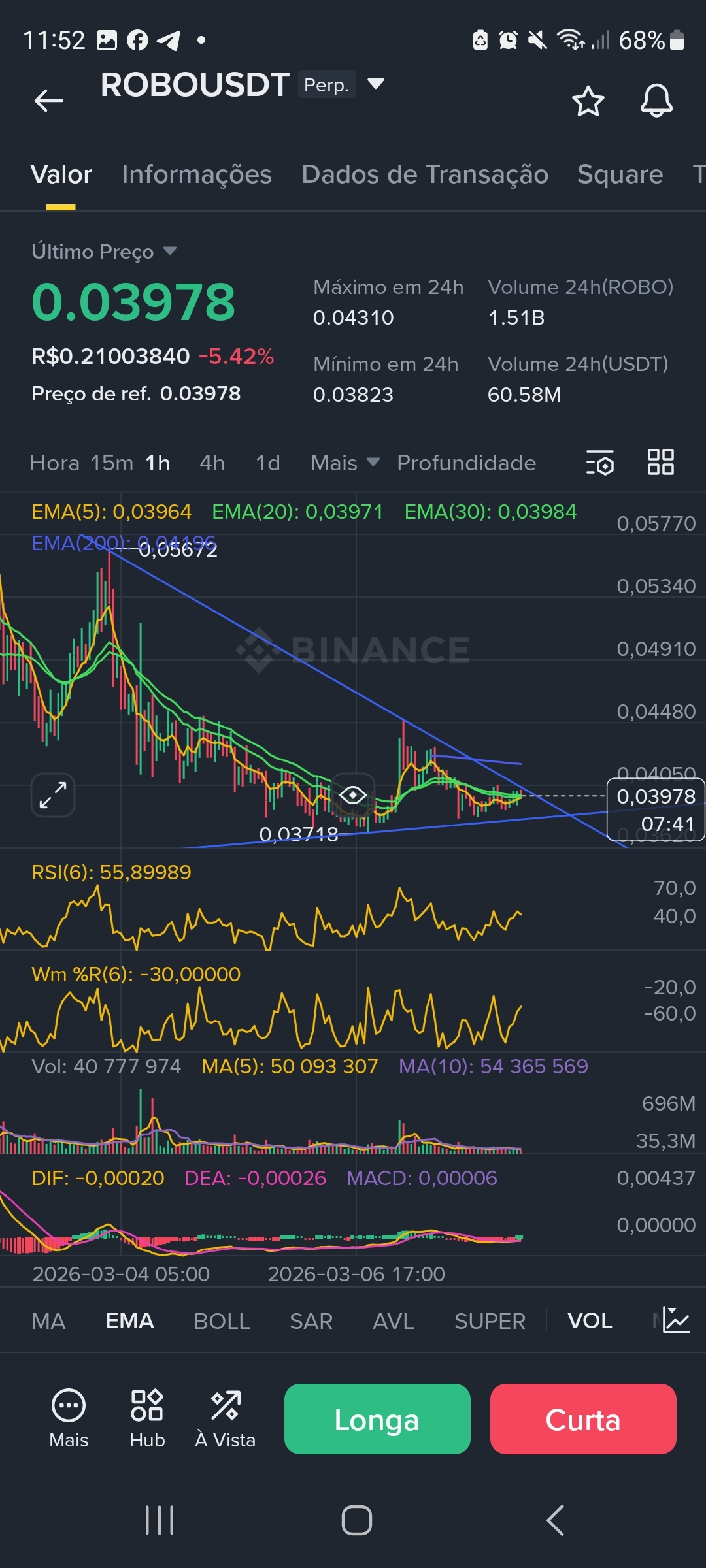 * Gráfico 1H / 15M: No tempo gráfico de 15 minutos, o preço tenta romper a EMA(200) em 0,04015. O RSI(6) em 53,17 mostra uma leve recuperação de força compradora, mas o volume decrescente sugere falta de convicção para o rompimento da LTB principal.