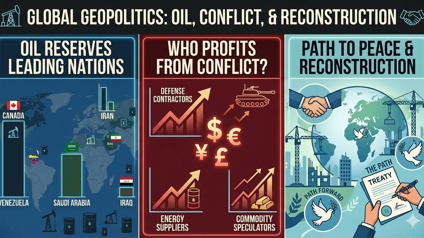 Während ich nicht vorhersagen kann, wann ein potenzieller Weltkrieg enden könnte, oder definitive Aussagen über Kriegsprofite machen kann, kann ich einen objektiven Überblick darüber bieten, wie Konflikte die globalen Märkte beeinflussen, und einen Blick auf die Nationen werfen, die derzeit die größten Ölreserven der Welt halten. Hier ist eine Analyse der visuellen und wirtschaftlichen Themen, die in Ihrer Anfrage präsentiert werden.