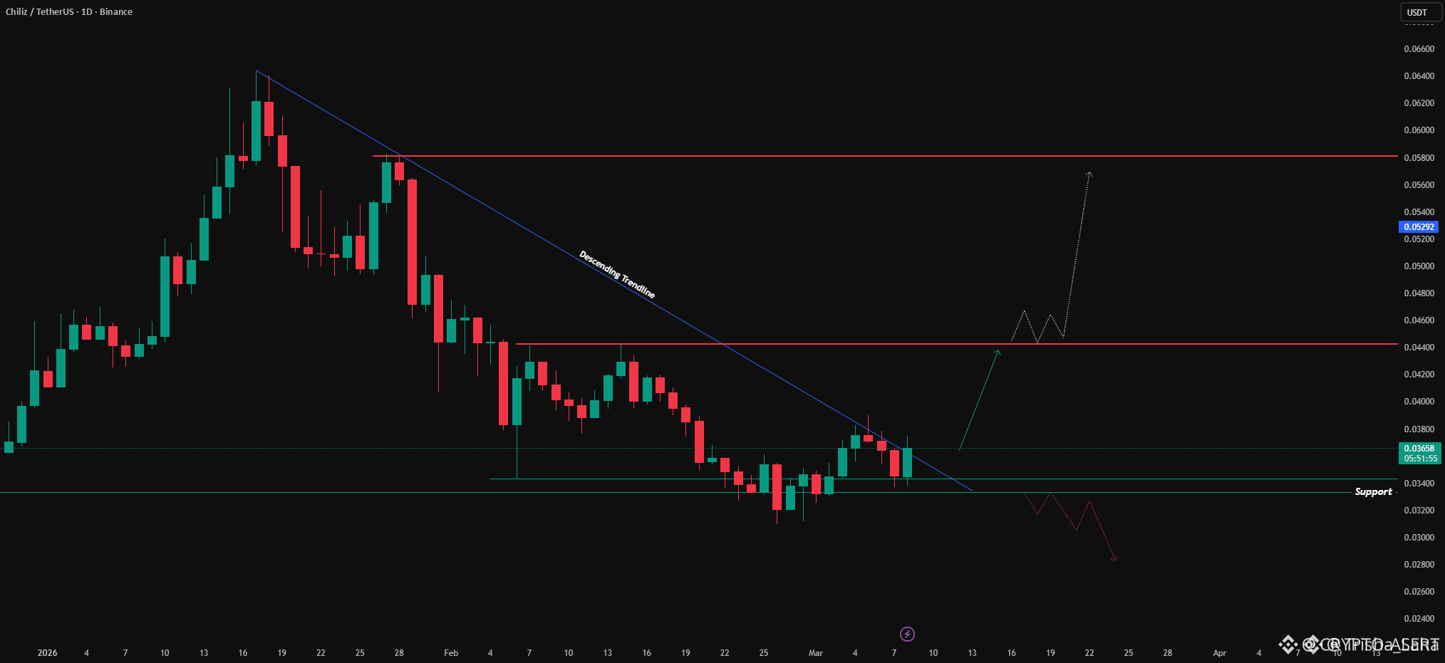 After months of grinding through a persistent downtrend, $CHZ is finally reaching a boiling point. The price is currently compressed tightly against a major descending trendline while stubbornly holding a multi-month support base. In the world of trading, this kind of squeeze usually precedes a massive volatility spike! đ