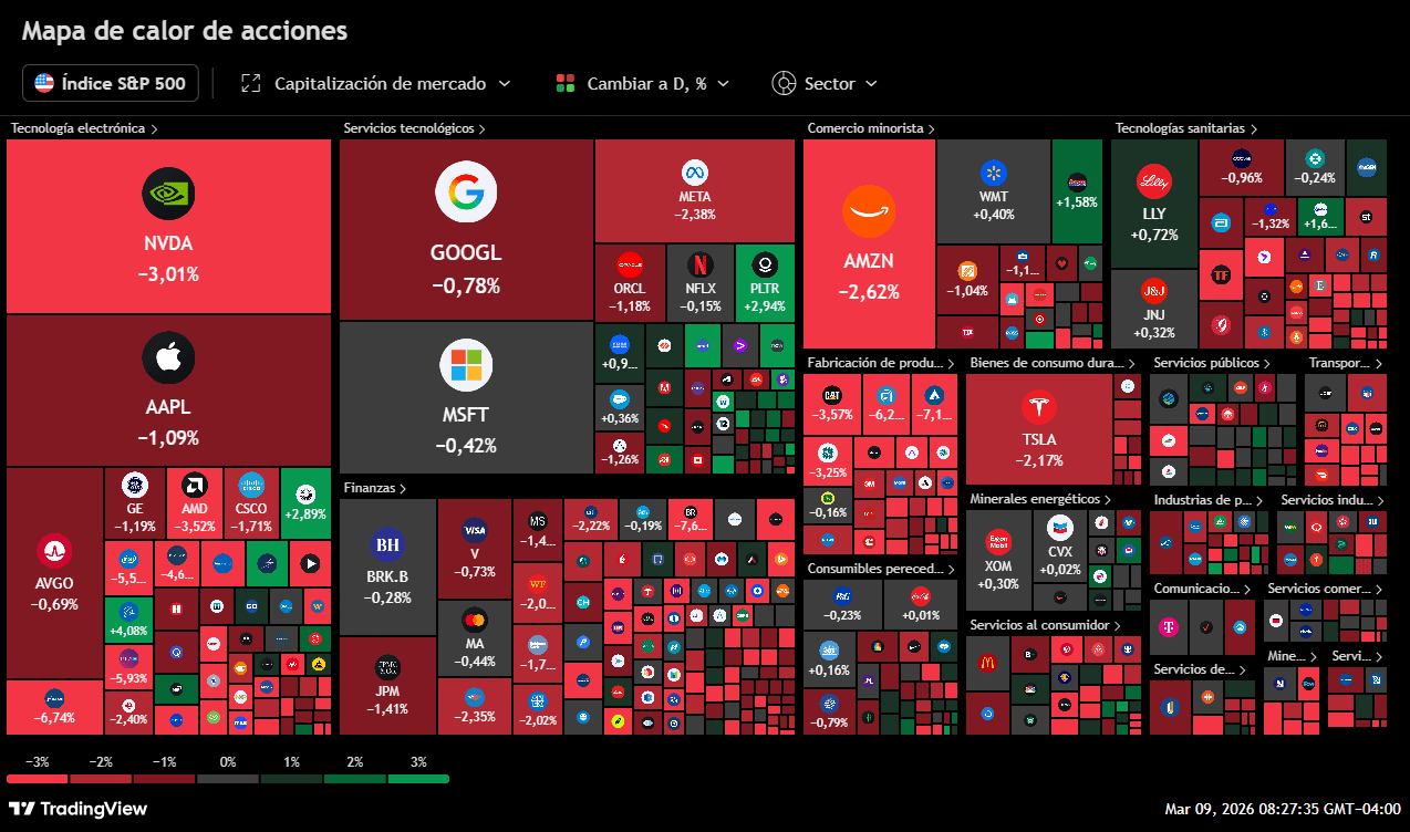 Lo que estamos viviendo hoy, 9 de marzo de 2026, no es una corrección ordinaria; es un reajuste violento del orden económico global. En una apertura histórica, los futuros de Wall Street se tiñeron de rojo intenso mientras el crudo Brent desafiaba la gravedad.