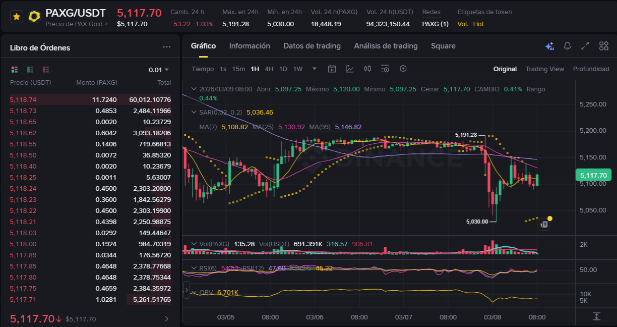 • Expectativa: Para las próximas horas, esperamos que PAXG intente consolidar sobre los $5,100. Si el petróleo sigue subiendo por encima de los $115, el oro rebotará con fuerza por su papel como cobertura contra la inflación.