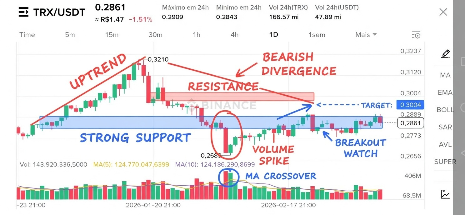 🔥 TRX em 0.2861 – segura o suporte ou explode pra cima?