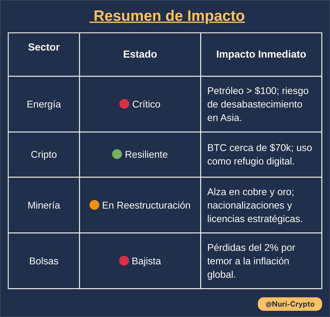 El panorama global se ha vuelto significativamente más complejo en las últimas horas debido a la convergencia de una guerra energética, hitos en activos digitales y reestructuraciones mineras estratégicas.