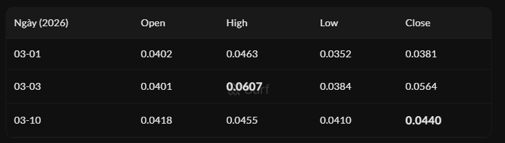 Dữ liệu CoinGecko (1-10/3/2026) cho thấy $ROBO dao động mạnh: đỉnh 0.0607 USD (3/3), hiện 0.044 USD (+10.83% 24h), MC 103 triệu USD (rank trung bình). Vol 24h 61.6 triệu USD chiếm tỷ lệ cao so MC, liquidity tốt.