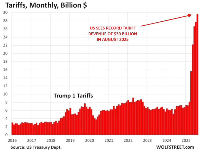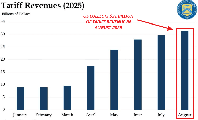 Allein im August 2025 hat die US-Regierung 31 Milliarden USD an Zöllen eingenommen – die größte monatliche Einnahme in der amerikanischen Geschichte. 🏆