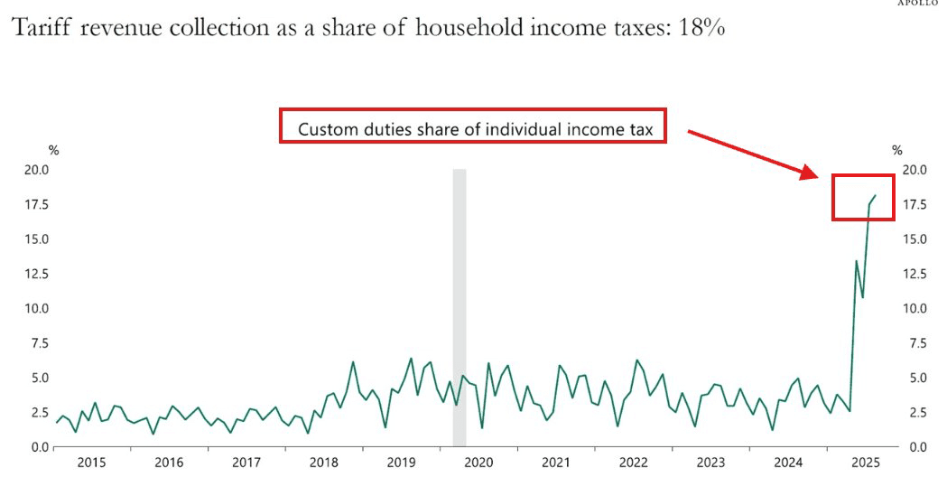 Zölle machen jetzt 18% der Einkommenssteuern der Haushalte aus, ein Niveau, das seit über 80 Jahren nicht mehr gesehen wurde. Selbst der Trump Handelskrieg 1.0 erscheint im Vergleich dazu winzig. 😳