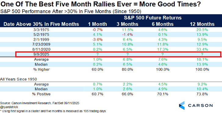 👉 Die Geschichte sagt: In den 5 vorherigen Fällen, in denen der S&P in 5 Monaten über 30 % gewonnen hat, hielt er im Durchschnitt weitere +18 % im nächsten Jahr an. 🚀
