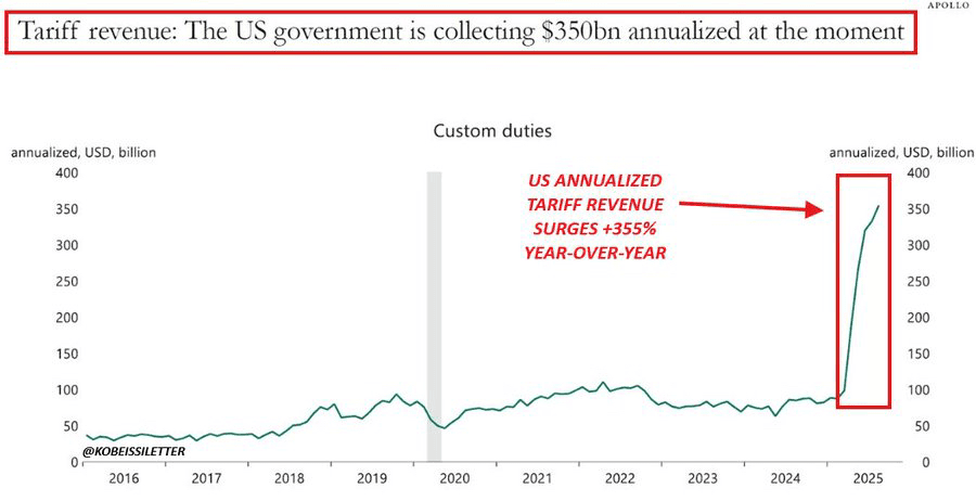 Die annualisierten Tarif-Einnahmen sind auf 350 MILLIARDEN USD gestiegen – das ist ein atemberaubender Anstieg von +355% im Vergleich zu 2024. 💰🚀