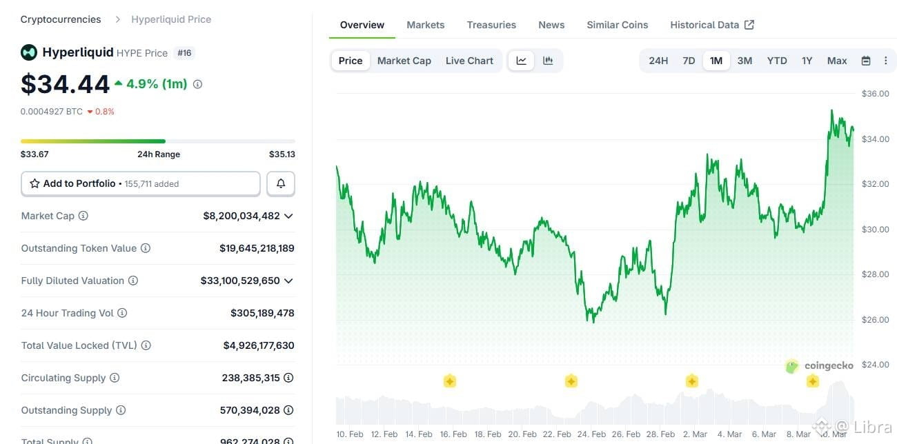 - Theo dữ liệu từ CoinGecko, giá token HYPE đã tăng lên 35,28 USD, mức cao nhất trong hơn một tháng qua. Trong tuần vừa qua, token này ghi nhận mức tăng khoảng 10,9% và hiện đang dao động quanh mốc 34,34 USD.Một trong những yếu tố chính thúc đẩy đà tăng của HYPE là sự bùng nổ của các hợp đồng perpetual dầu thô token hóa trên Hyperliquid.