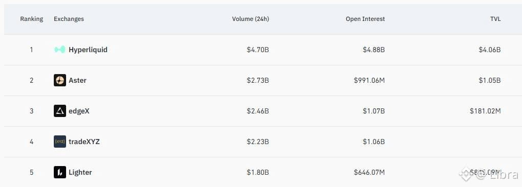 - Theo dữ liệu từ CoinGlass, Hyperliquid hiện ghi nhận gần 5 tỷ USD tổng số open interest, khoảng 4,7 tỷ USD khối lượng giao dịch trong 24 giờ và 4,06 tỷ USD TVL. Những con số này giúp Hyperliquid vượt qua nhiều đối thủ trong mảng perp DEX như Aster, Lighter và EdgeX.