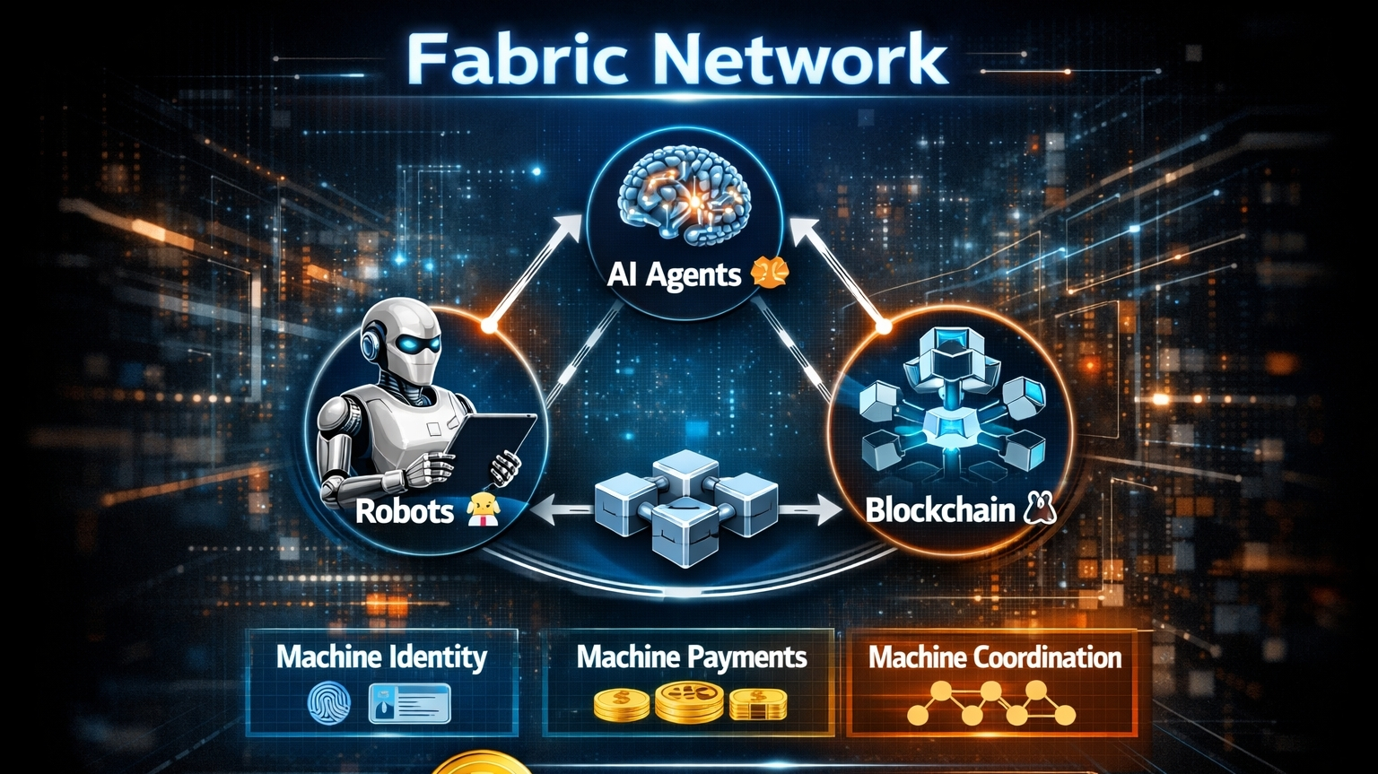Fabric provides financial rails allowing robots and AI agents to receive payments, execute tasks, and interact with decentralized markets.