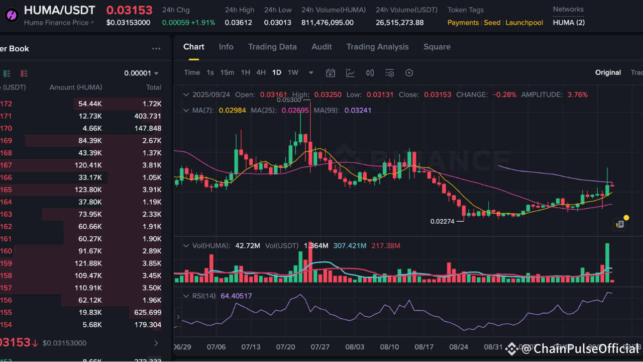 3. Frühe Dynamik: In den letzten 24 Stunden erlebte HUMA einen signifikanten Preisanstieg und stieg von $0.02982 auf ein Hoch von $0.03507, was einem Anstieg von etwa 17,6 % entspricht, begleitet von hohem Handelsvolumen, was auf starkes Kaufinteresse hinweist.
