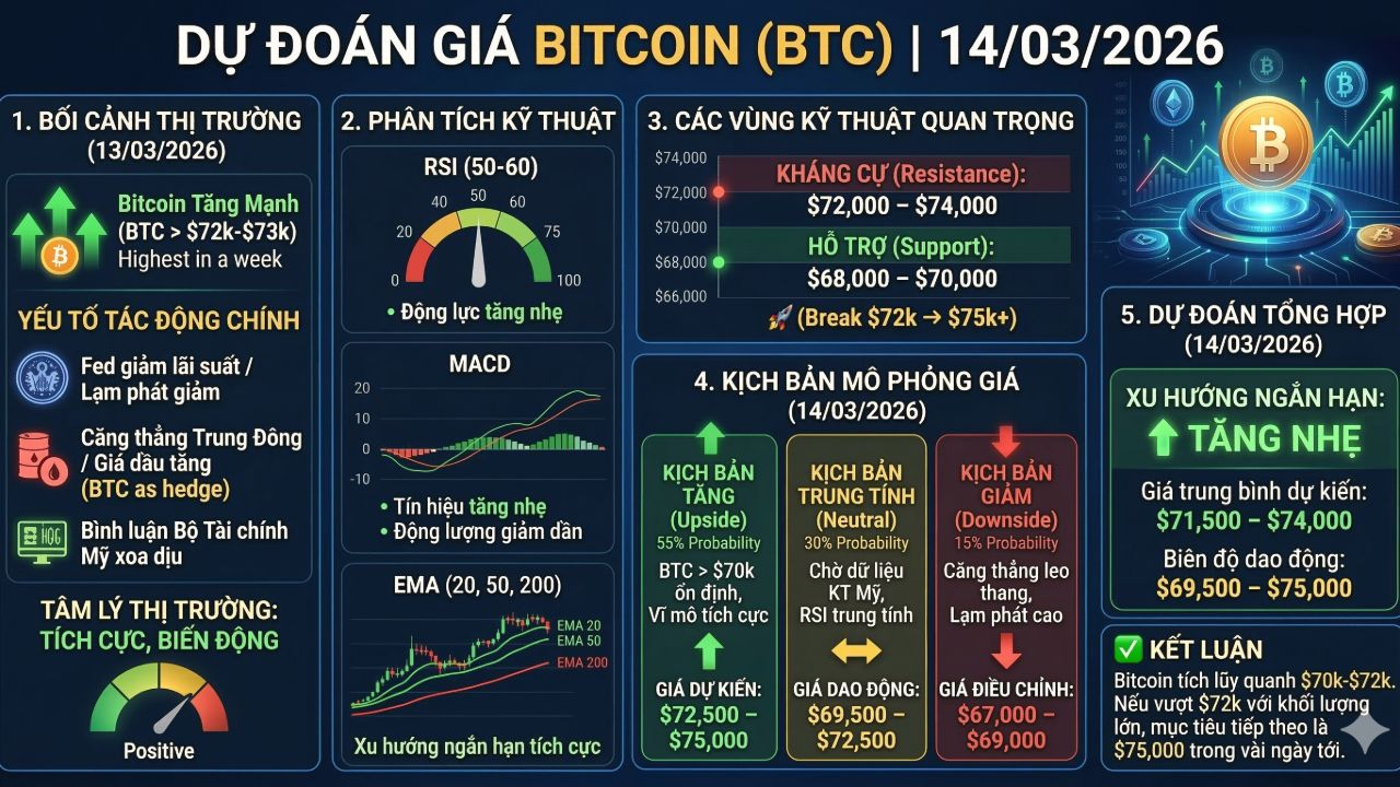Am 13.03. stieg Bitcoin stark an und überschritt zeitweise 72.000–73.000 USD, was den höchsten Stand seit über einer Woche markiert.