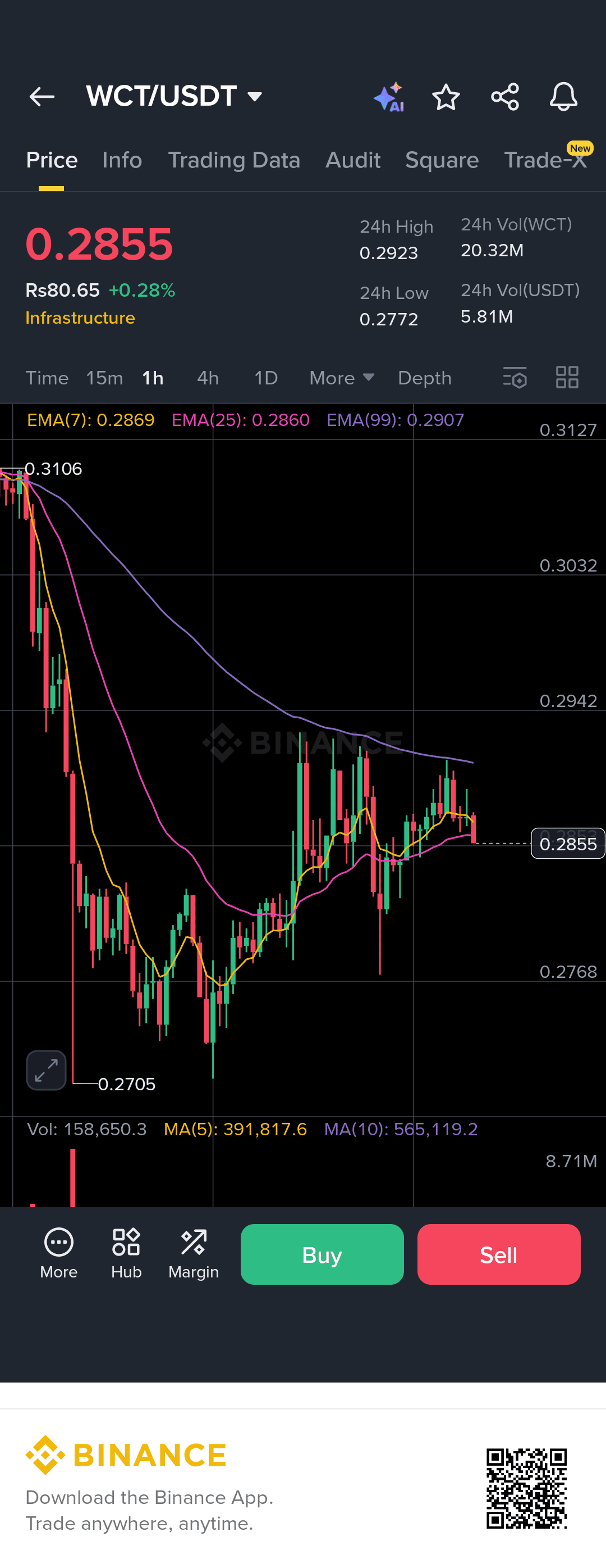 HODLers, hört zu! 💁♂️ WCT/USDT wird derzeit bei 0.2855 USDT mit einem leichten Anstieg von +0.28% gehandelt. Wenn wir auf das Diagramm 📊 schauen, sehen wir, dass WCT über wichtigen Unterstützungsniveaus nach einem Rückgang hält. Die EMA-Linien (7, 25, 99) zeigen Konsolidierung 🔩, und das Volumen 📈 ist anständig mit 20.32M WCT, die in 24h gehandelt wurden.