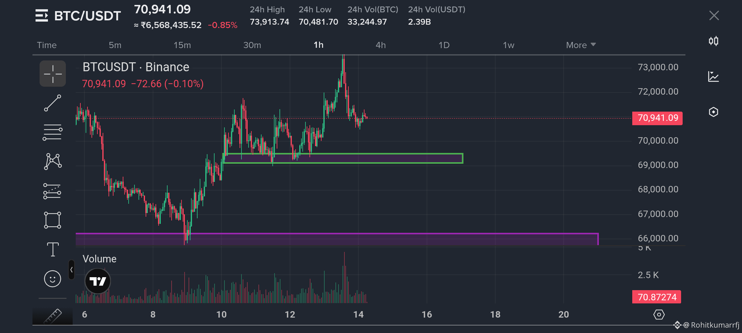 Bitcoin अभी लगभग $70,900 के आसपास ट्रेड कर रहा है और मार्केट में हल्का consolidation देखने को मिल रहा है। Chart में साफ दिख रहा है कि price एक strong support zone से bounce लेकर ऊपर आया है।