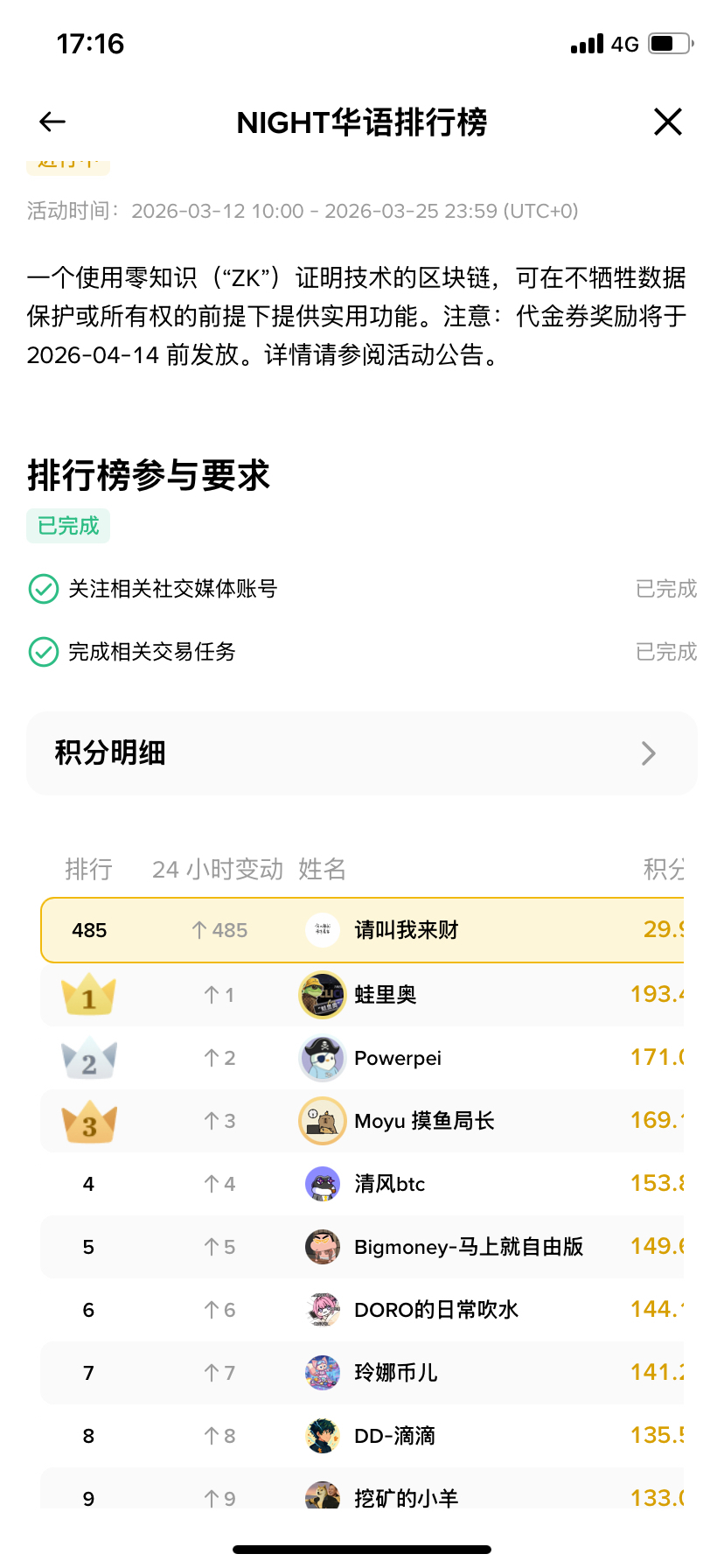 第一次参加嘴撸,#night 项目方非常给力,给了500个名额。今天的榜单更新了,大家快去看看是否入榜了?
