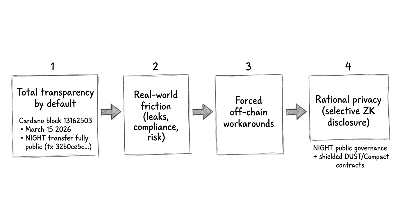 Three quick things I keep coming back to after watching this stuff for years: first, most users don’t want their entire financial life indexed; second, businesses can’t run real contracts on fully transparent rails; third, selective disclosure actually works if the tools don’t suck. Midnight Network’s NIGHT token and its upcoming rational privacy layer are trying to thread that needle.
