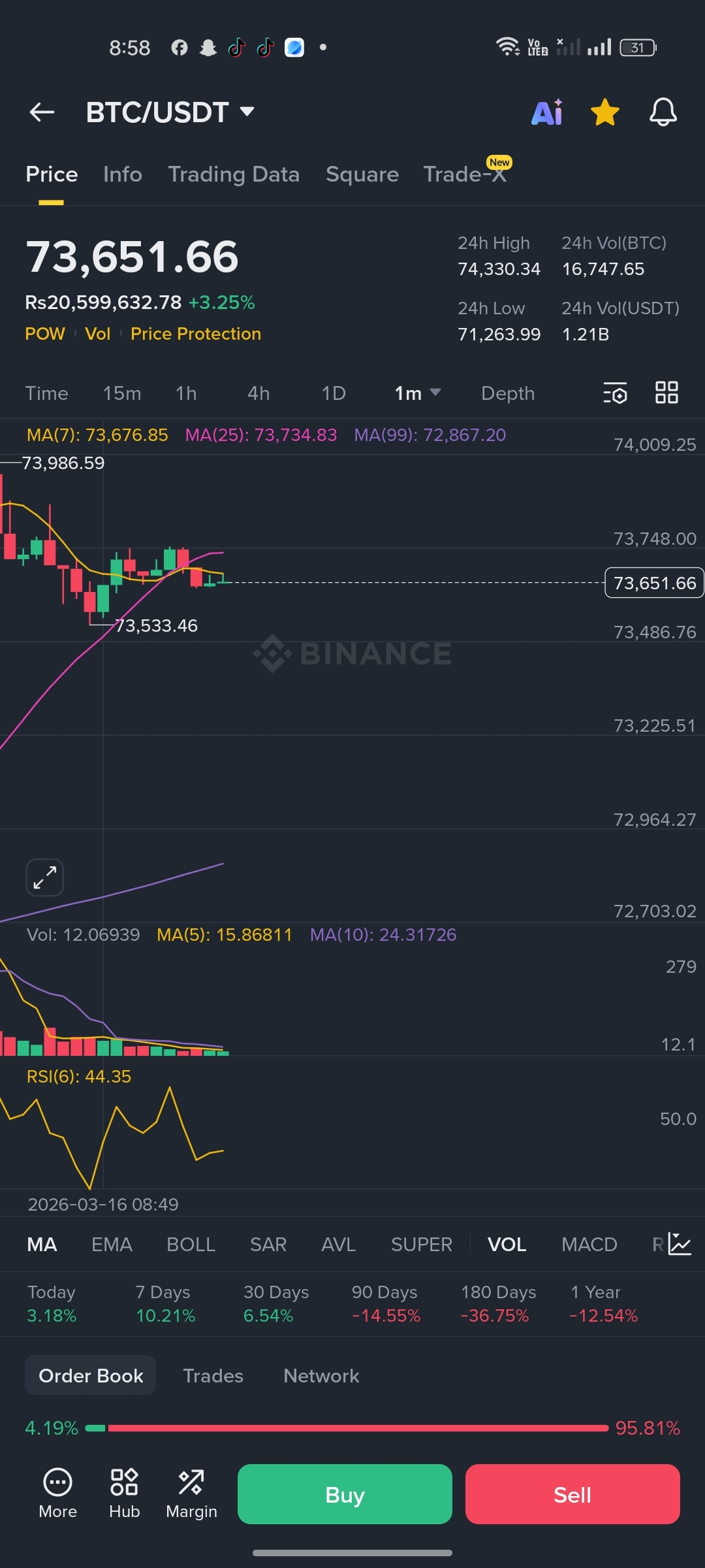 Bitcoin is currently trading just below its 7-day Moving Average (MA) of $73,676.85 and the 25-day MA of $73,734.83. While it is slightly under these short-term averages, the fact that it is holding firmly above the crucial 99-day MA of $72,867.20 is a massive bullish signal.