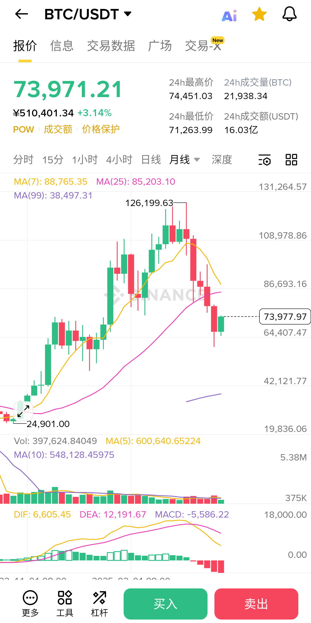 2. 月线级别(警惕): 值得注意的是,虽然价格创新高,但月线 MACD 红色柱状图仍在向下放大(目前为 -5,586.22)。这种“价升指标降”的背离现象提醒我们:宏观上的压力并未完全释放,目前的拉升带有极强的“逼空”属性,追高时需预留防守位。