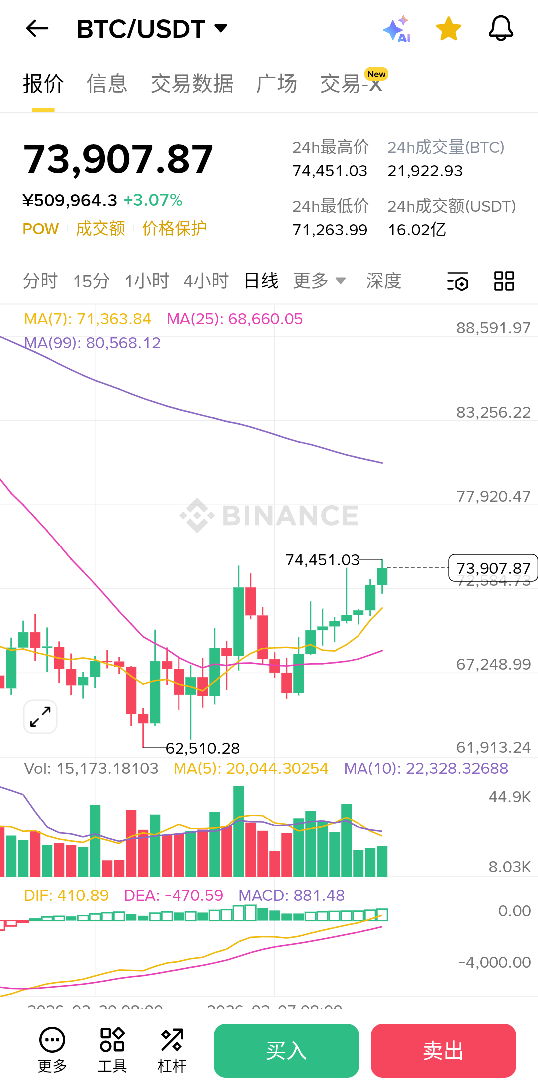1. 日线级别(看多): 典型的 8 连阳,价格踩着 MA7 匀速上行。MACD 的 DIF(410.89)已冲破零轴,短期买盘动能非常充沛,这是典型的“疯牛”加速状态。