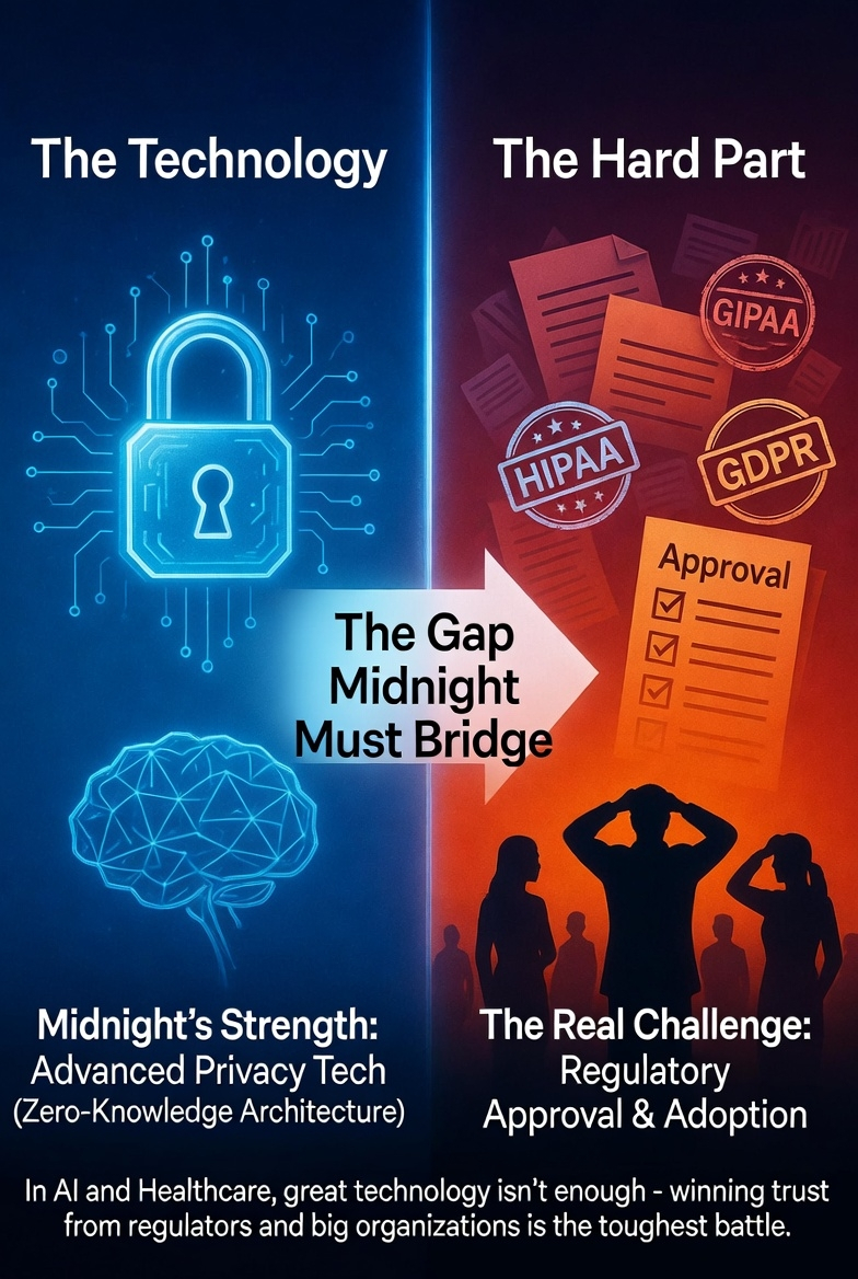 The core idea is strong, and the direction feels right. Healthcare and AI are exactly the fields crying out for this kind of privacy-first approach. The big question hanging over everything is simple: how does Midnight plan to bridge the gap between its clever code and the mountain of regulatory demands that change from country to country?
