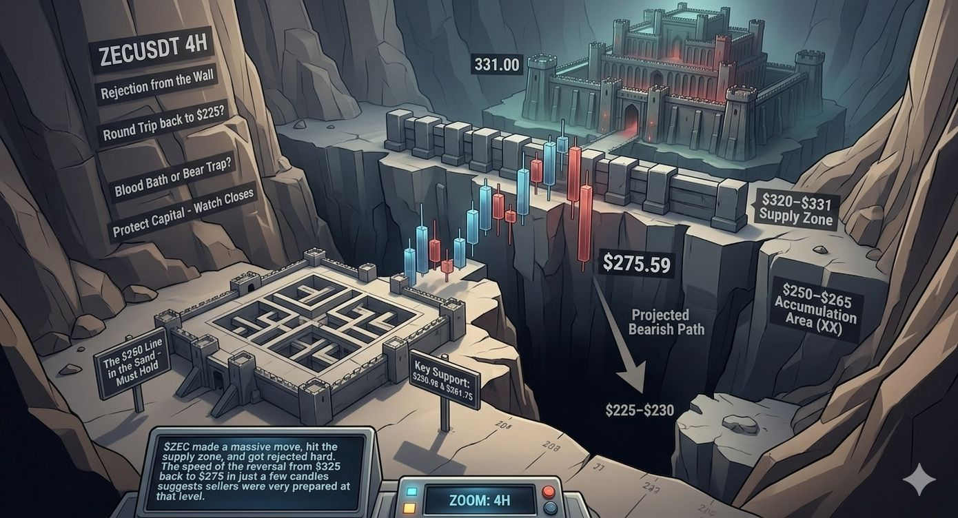 Die jüngste Preisbewegung bei Zcash ($ZEC ) war nichts weniger als ein gewaltsamer Weckruf für späte Bullen. Nach einer stagnierenden Konsolidierungsphase zwischen $195 und $250 erlebte der Markt einen explosiven vertikalen Anstieg. Dieser Schwung traf jedoch auf eine titanhafte Decke im Angebotsschwerpunkt von $320–$331, was zu einer so aggressiven Ablehnung führte, dass ein erheblicher Teil der Ausbruchgewinne in Rekordzeit ausgelöscht wurde.