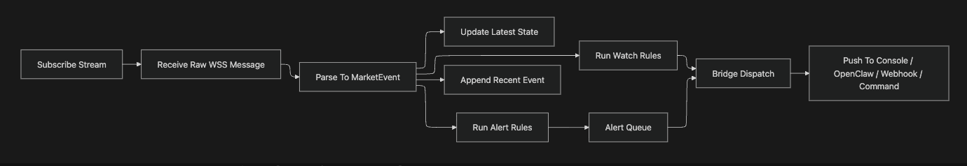 在这个架构中,Agent 不再直接连接 Binance,也不再处理原始的 WebSocket 数据。所有底层逻辑都由本地服务统一完成,包括连接管理、订阅控制、数据解析、状态缓存以及事件检测。Agent 只需要通过简单的 CLI 命令与这个系统交互。