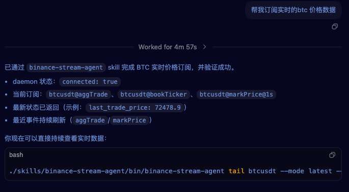 这个项目的核心思路是,将“轮询”转变为“事件驱动”。我基于 Binance 提供的 Rust connector 和 WebSocket 数据流,构建了一个本地运行的实时数据客户端(CLI + daemon),专门作为 Agent 的市场数据层使用。