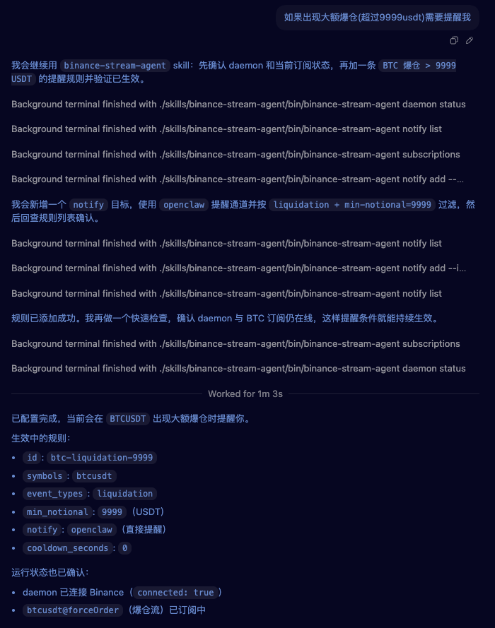 这样带来的改变是本质性的。首先是实时性,基于 WebSocket 的数据是持续推送的,系统可以实现接近毫秒级的监控能力。其次是职责划分的清晰,Agent 不再需要关心任何数据获取和处理的细节,只需要关注策略本身。例如,它可以简单地表达一个意图:“如果 BTC 出现大幅下跌,立即通知我”,剩下的工作都由底层系统完成。