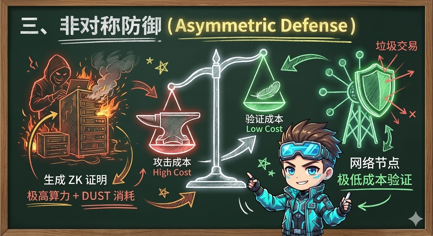 在 Midnight 网络中发起一笔屏蔽交易,攻击者必须消耗 DUST,并在本地耗费庞大的算力来生成 ZK 证明。白皮书指出,生成一个 ZK 证明的计算成本,远远高于网络验证它的成本。如果攻击者试图通过发送海量垃圾交易来瘫痪网络,其不仅会迅速耗尽自身的 DUST 资源,还将承担极高的“自我沉没算力成本”。这种非对称的博弈设计,在经济逻辑上极大地削弱了恶意黑客的攻击动机。