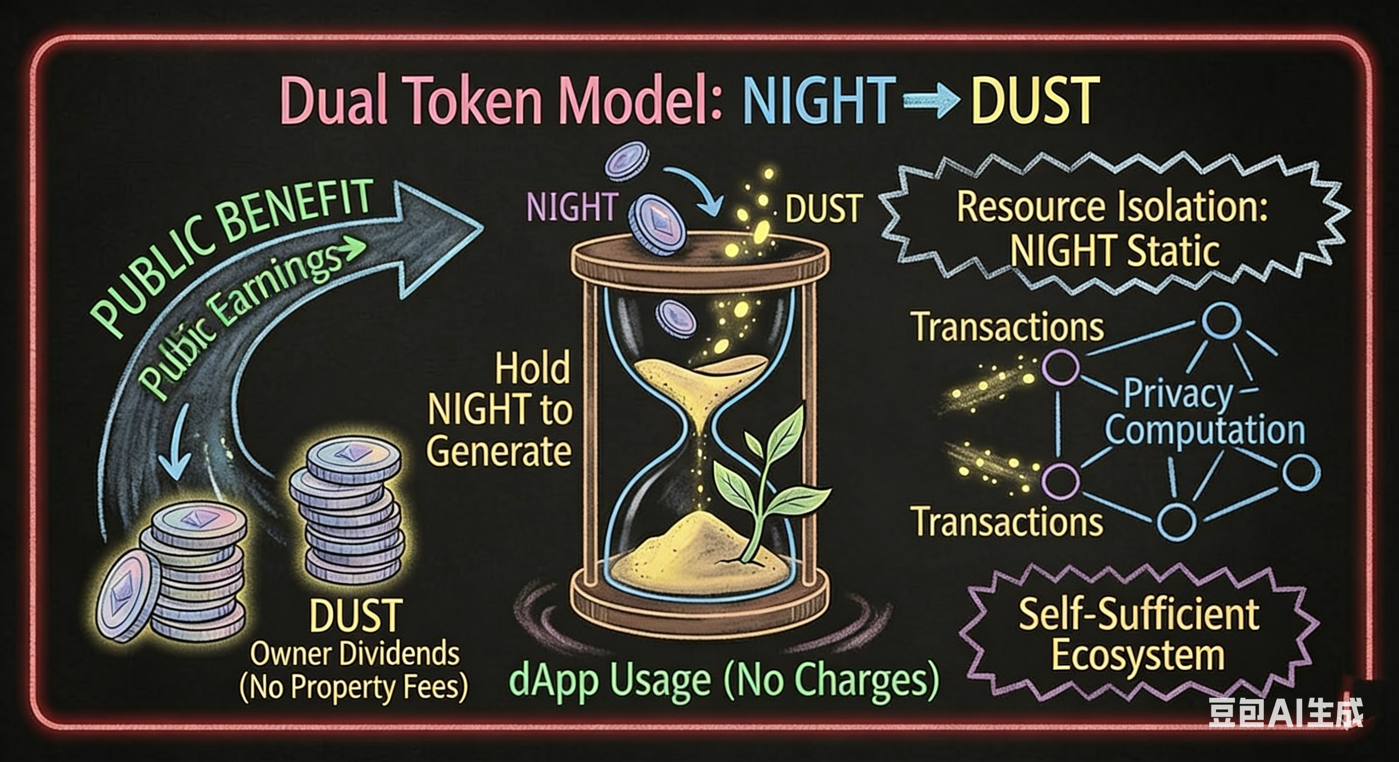 DUST:质押NIGHT自动生成的隐私燃料,企业跑私密智能合约必须燃烧DUST来完成零知识证明——既向审计方自证资金合规,又能把商业机密锁死,对手方无从窥探。