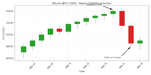 March 2026 has been a heavily volatile month for Bitcoin (BTC). As visualized in the candlestick chart above, the cryptocurrency enjoyed a powerful rally through the first half of the month, successfully breaking through resistance and topping the $74,000 mark on March 16. However, the momentum faced a sharp rejection shortly after, dragging prices back into the $68,000–$69,000 range. This pullback appears to be a mix of pre-event positioning, profit-taking, and reactions to broader macroeconomic headwinds.