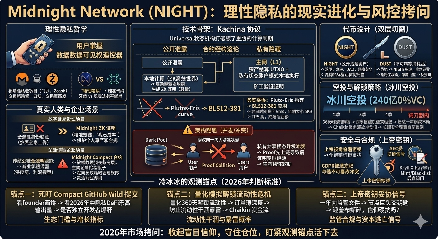 2026年的市场波诡云谲,Midnight的命门还太多:法律惯性未破、解锁洪峰未过、生态乐高未成。我的建议简单粗暴——收起盲目信仰,守住仓位,盯紧我说的三个锚点。在真相彻底揭晓前,活下去才是Web3唯一的铁律。别让NIGHT在妥协的深渊里无声湮灭,等到代码真正扛住现实的那一天,再谈星辰大海也不迟。#night