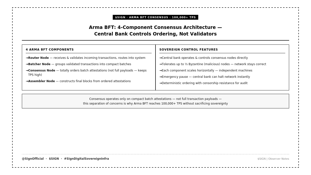 Then theres the consensus layer — Arma BFT — which is also broken into four separate components. the router node receives and validates incoming transactions. the batcher node groups them into batches. the consensus node orders compact batch attestations, not full transaction payloads, which keeps throughput high. the assembler node constructs the final blocks. each component scales horizontally across multiple machines independently, which is how the system reaches 100,000+ transactions per second.