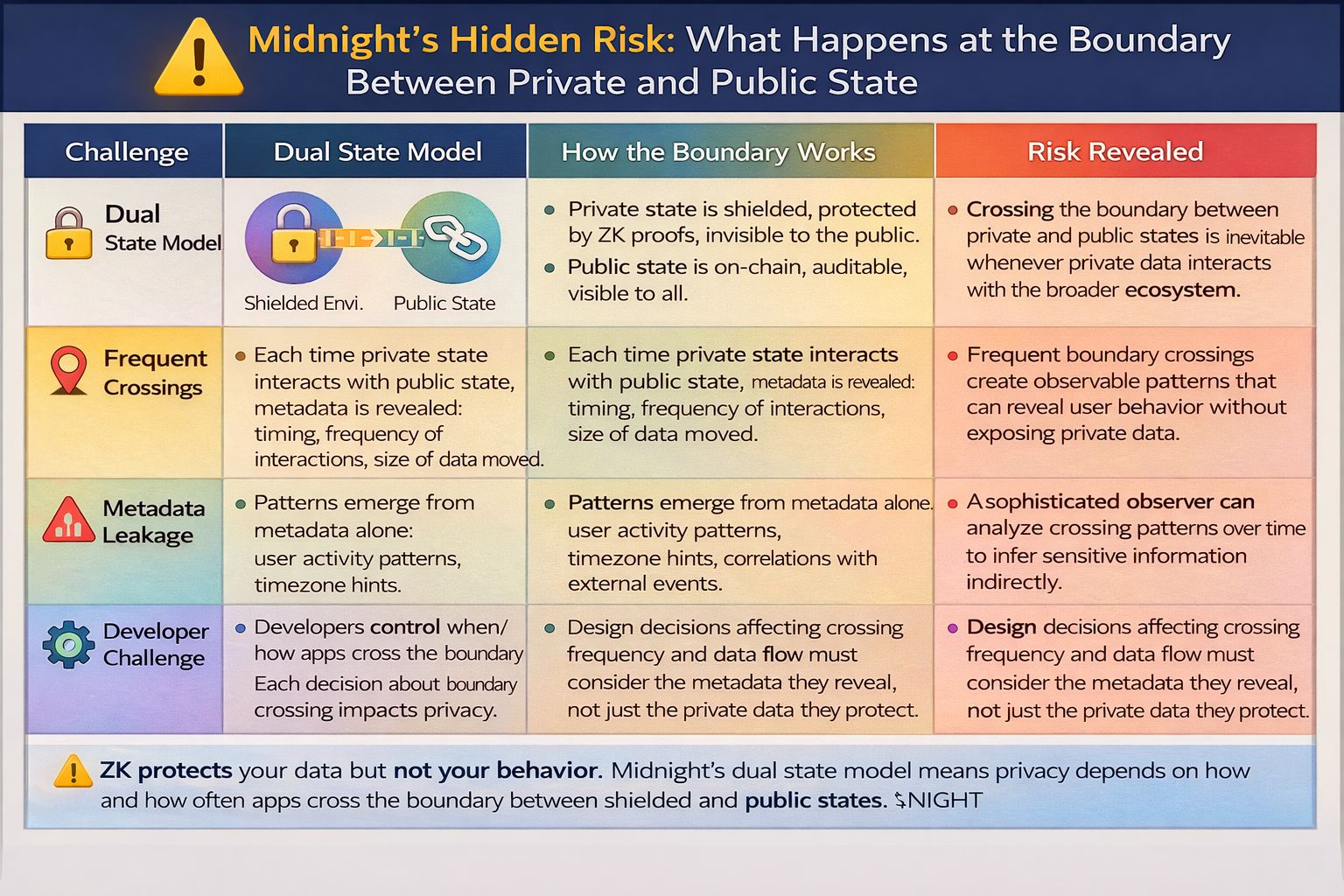 a sophisticated observer watching the public chain doesn't need to break the ZK proofs to learn things about a Midnight application's user base. they just need to watch the boundary.