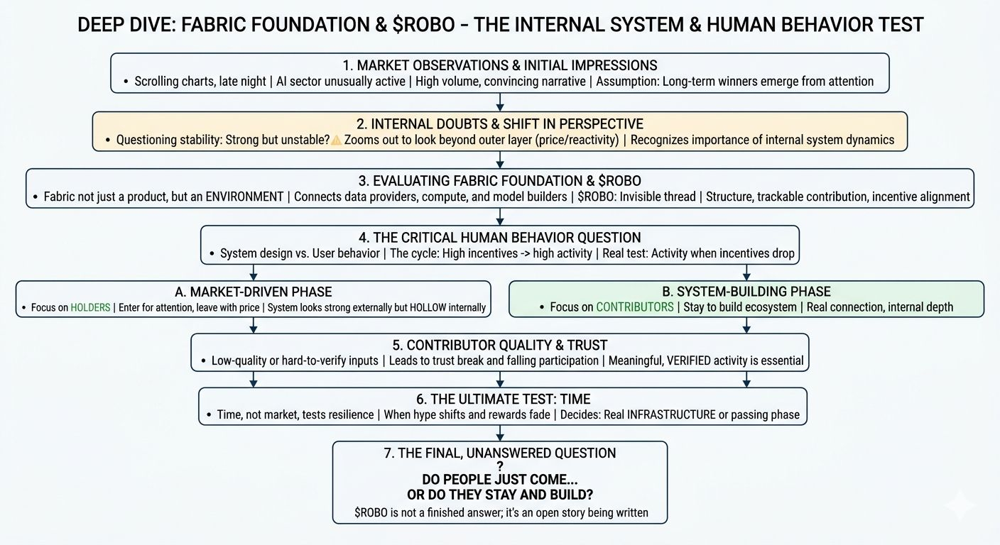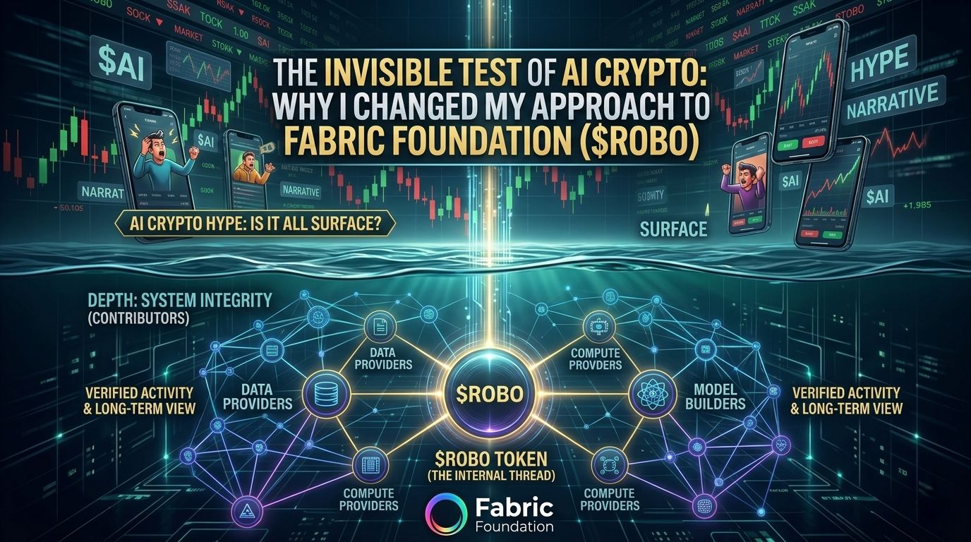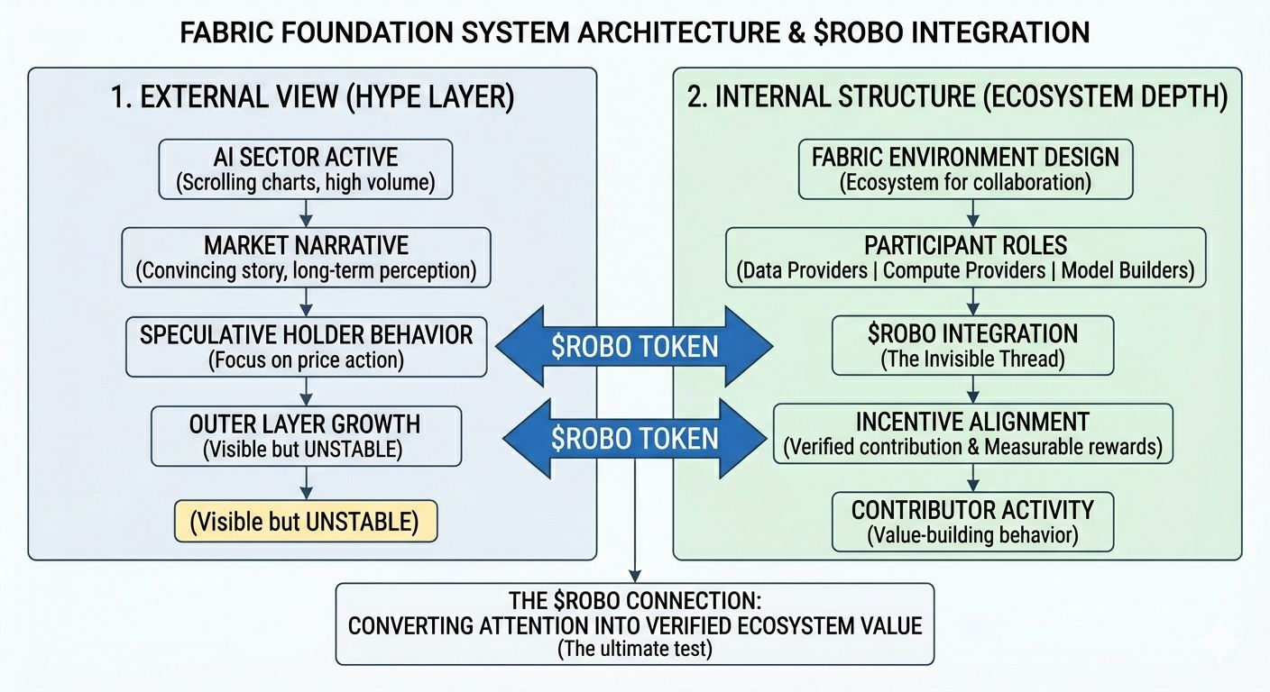 When I zoomed out I started seeing a pattern. What I was looking at wasn't the actual system. It was just the outer layer where prices move people react and narratives are born. Almost nobody was looking at what was happening deep inside. That is when my approach changed and with this mindset I started looking at the Fabric Foundation and $ROBO. At first I thought it was just another AI hype project following the same cycle. But after spending more time on it I felt a subtle difference. It is not just a product it is an environment. You have different people bringing different things like data compute power or building models. They are all connected but that connection isn't accidental. It has to be designed.