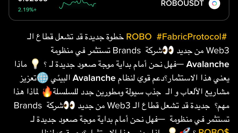 #ROBO #FabricProtocol خطوة جديدة قد تشعل قطاع الـ Web3 من جديد 👀شركة Brands تستثمر في منظومة Avalanche —فهل نحن أمام بداية موجة صعود جديدة لـ ؟ 💡 ماذا يعني هذا الاستثمار؟دعم قوي لنظام Avalanche البيئي 🌐تعزيز مشاريع الألعاب و الـ جذب سيولة ومطورين جدد للسلسلة🔥 لماذا هذا مهم؟ جديدة قد تشعل قطاع الـ Web3 من جديد 👀شركة Brands تستثمر في منظومة —فهل نحن أمام بداية موجة صعود جديدة لـ $ROBO ؟ 🚀💡 ماذا يعني هذا الاستثمار؟دعم قوي لنظام Avalanche البيئي 🌐تعزيز مشاريع الألعاب و الـ NFT 🎮جذب سيولة ومطورين جدد للسلسلة🔥 لماذا هذا مهم؟#ROBO FabricProtocol