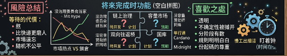 没链上治理,现在的委员会就得一直当家;没容量市场,没持有 NIGHT 的人就只能靠别人赞助才能挤进网络;没那座两方向桥,NIGHT 从 Cardano 过去就回不来了,成了单行道。这些功能,缺一个,Midnight 的完整叙事就少一块拼图。至于这些拼图啥时候能凑齐,没人说得准。