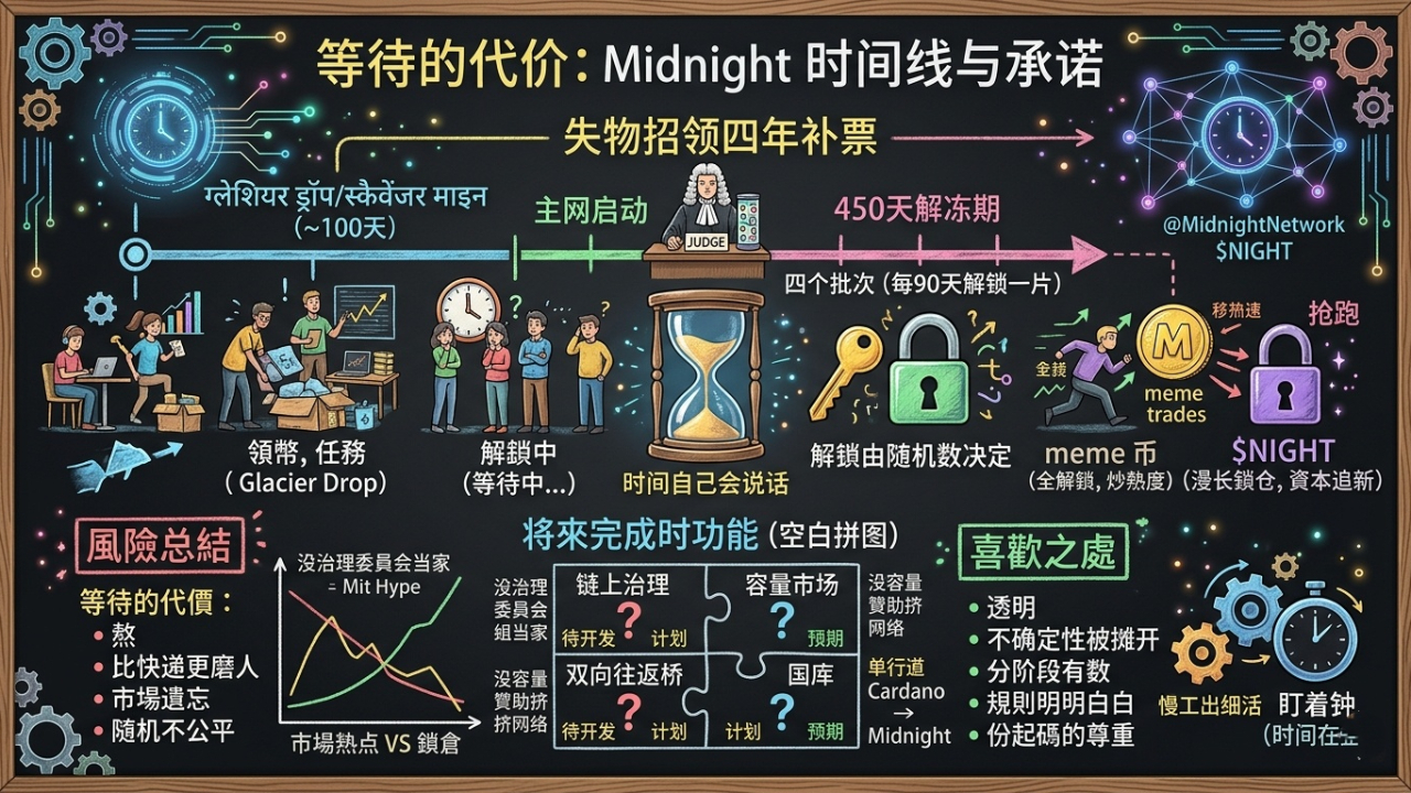 Midnight 给我的感觉,偏向后者。它这时间线里,藏着股“慢工出细活”的劲儿,虽说这股劲儿在疯跑的市场里看着有点不合时宜。我不知道 450 天后,当所有代币终于解锁,当那些“未来功能”终于上线,Midnight 还能不能跟白皮书里描述的模样对上。但至少,它给了我一个可以一直盯着的钟。