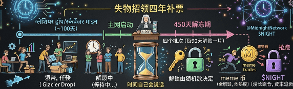 Midnight 这个 NIGHT 代币的分发,不是那种“空投完事儿,大家赶紧去交易”的路子。它给你排了一张横跨好几年的时间表:上来先是一百天的 Glacier Drop 加 Scavenger Mine,大家忙着领币、做任务,热火朝天;然后主网上线;上线之后,才是重头戏——450天的“解冻期”。你领到的币,不能马上拿走,得分四个批次慢慢解锁,每批间隔90天,更绝的是,哪天开始解锁还由随机数说了算。最后还留了个持续四年的“失物招领”窗口,给那些当初错过的人一个补票的机会。
