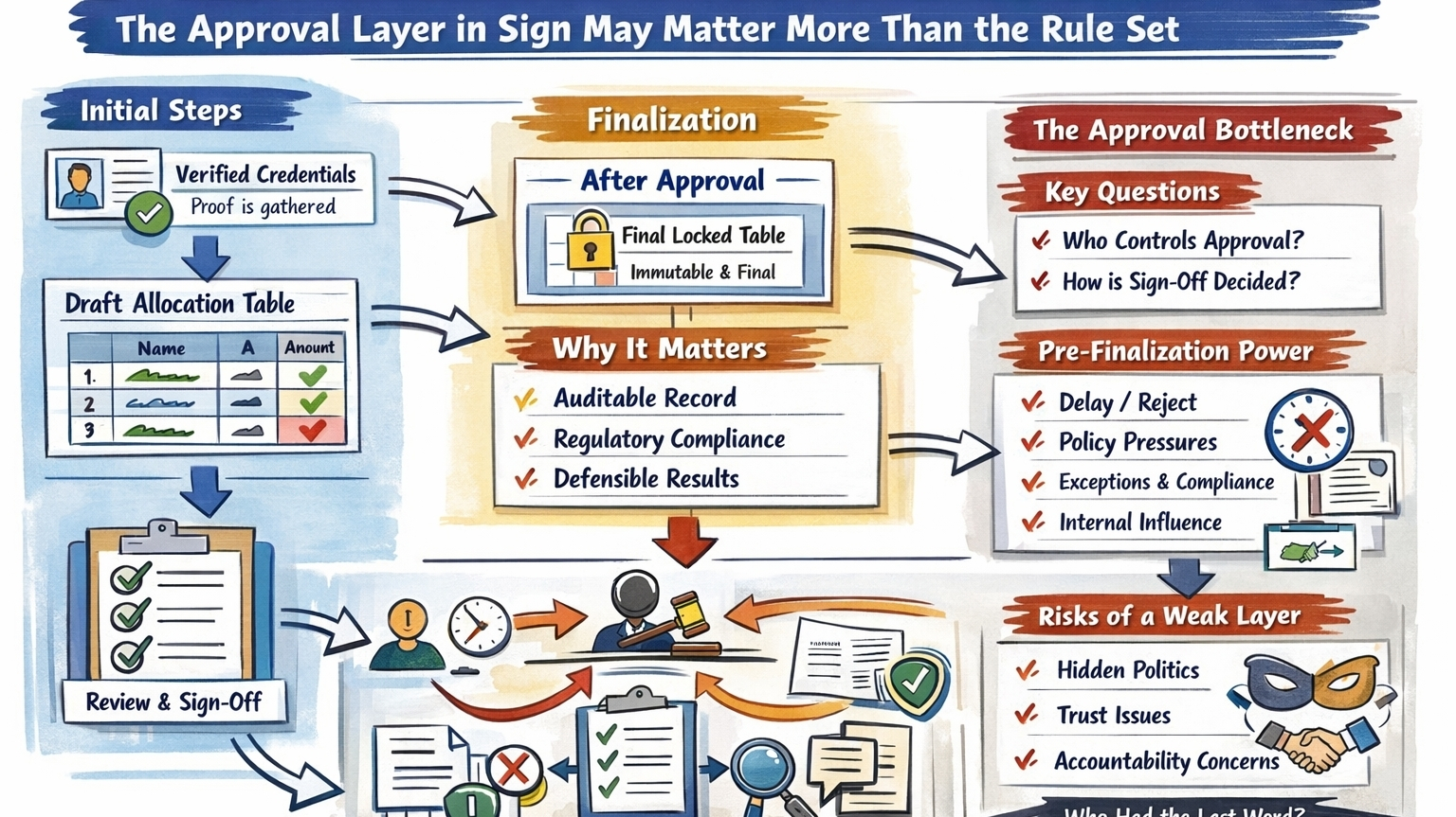 Take a basic serious-program workflow. Verified credentials help build the beneficiary set. A draft allocation table gets generated. Then someone inside the approval chain has to sign off before the table becomes immutable and downstream execution follows from that locked version. That is the point where late policy pressure, internal compliance concerns, exception requests, or institutional caution can hit hardest. Not after the table is frozen. Before.