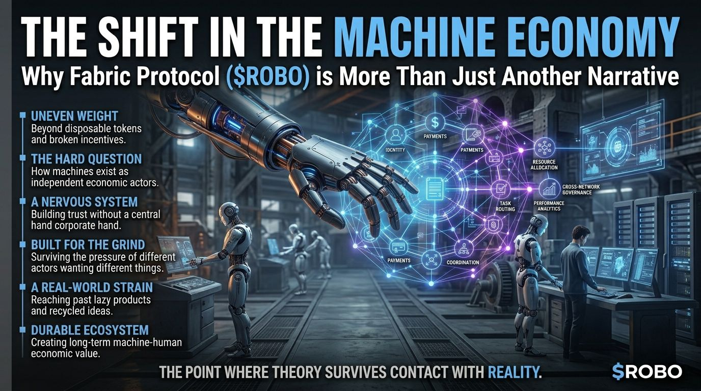 Most blockchain projects feel like they are read from the same tired script. We see the same cycle every time: a disposable token launches with high energy only to dissolve into a mess of broken incentives within weeks but Fabric Protocol ($ROBO) carries an uneven weight that demands a pause. It does not feel like a thought experiment. It feels like a direct confrontation with the future of machine-led infrastructure.