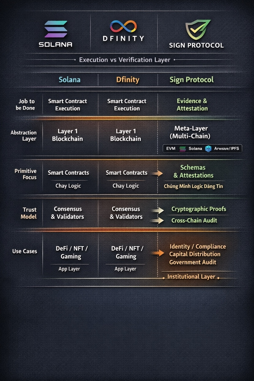 Nếu đặt Sign Protocol cạnh Solana hay Dfinity, bạn sẽ thấy một sự “lệch tầng” khá rõ và chính điều đó làm cho so sánh này thú vị.