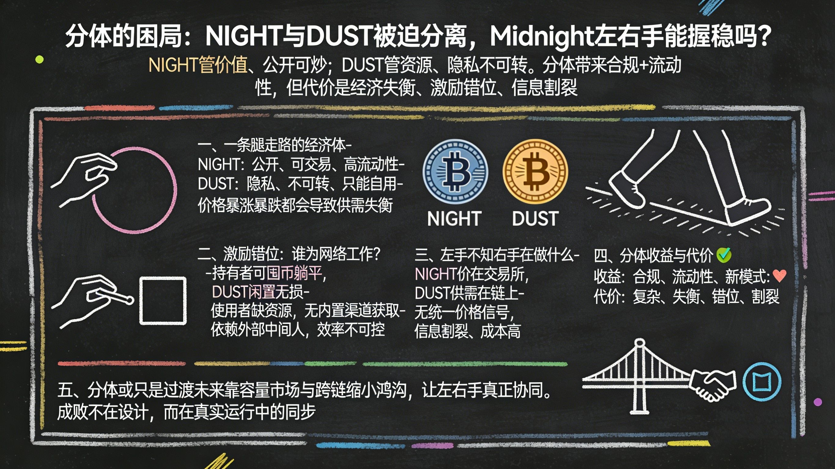 Midnight的白皮书看多了,我越来越觉得它像那个能画圆画方的人。NIGHT和DUST各司其职,一个管价值存储和治理,一个管网路资源和隐私。分开看,每个设计都很精巧。合在一起用,问题就来了:这两只手,真的能端稳那碗汤吗?