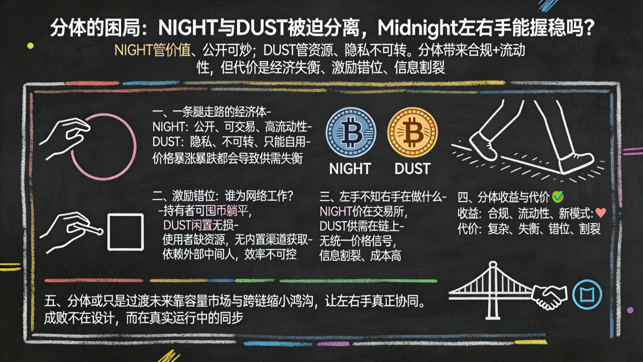 这意味着什么?意味着一个想用Midnight的人,必须同时拥有两条腿。但右腿(DUST)不能自己走路,必须靠左腿(NIGHT)拖着走。这就像一个人的右腿没力气,走路全靠左腿发力,右腿只是跟着晃。时间久了,左腿会累,右腿会废。