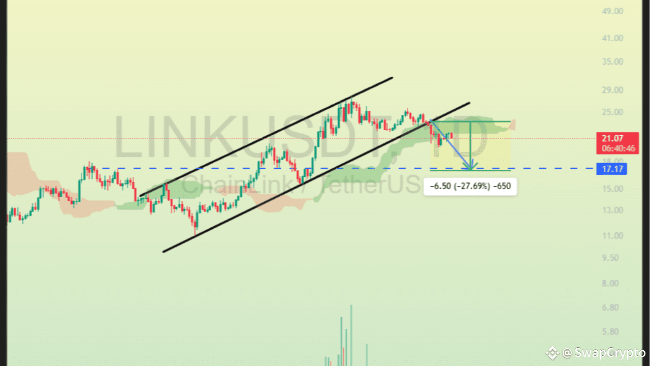 Chainlink hat seinen aufsteigenden Kanal durchbrochen und bewegt sich jetzt nach unten. Wenn der Verkaufsdruck anhält, könnte der Preis auf die Unterstützung bei 17 $ fallen. Momentum-Indikatoren zeigen ebenfalls Schwäche und signalisieren ein höheres Abwärtsrisiko.
