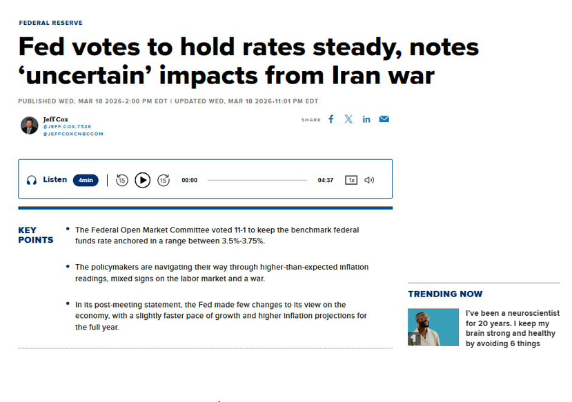 FOMC声明里有一句话让我印象很深:"The implications of developments in the Middle East for the U.S. economy are uncertain."鲍威尔在发布会上更直接,说了一句我觉得是今年央行声明里最诚实的话:"The thing I want to emphasize is nobody knows."