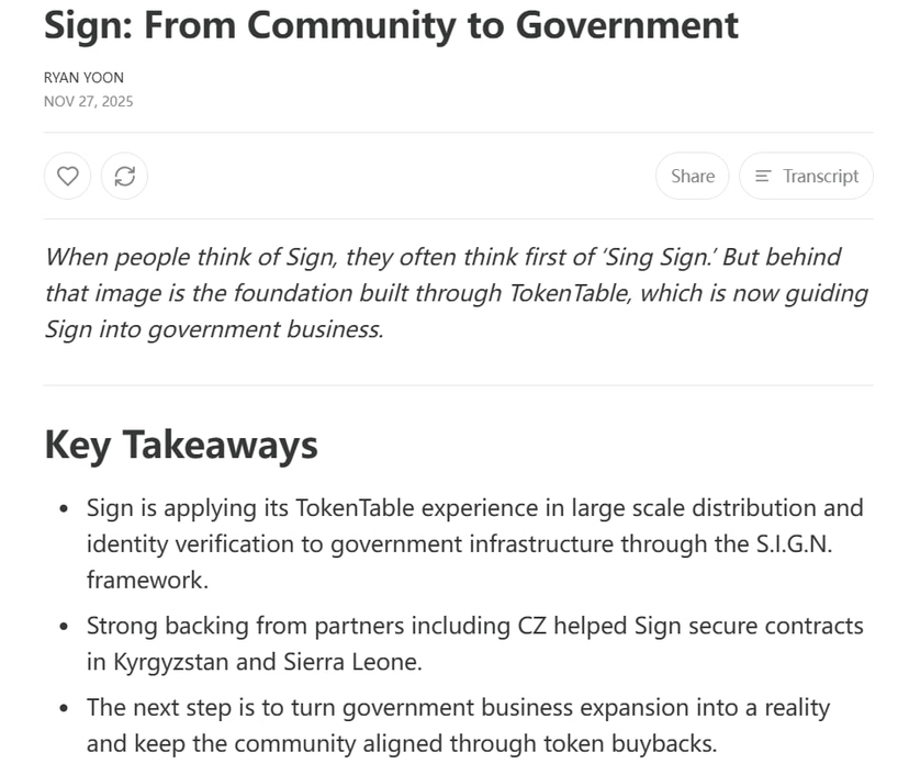 Tiger Research的报告把Sign的路径说得很清楚:TokenTable让Sign活下来,政府业务让Sign开始增长。TokenTable在Web3练出来的能力——$30亿代币分发,5500万个钱包,大规模分发加身份核验加防止重复领取——跟政府要发CBDC和社会福利补贴要解决的,是同一个技术问题。