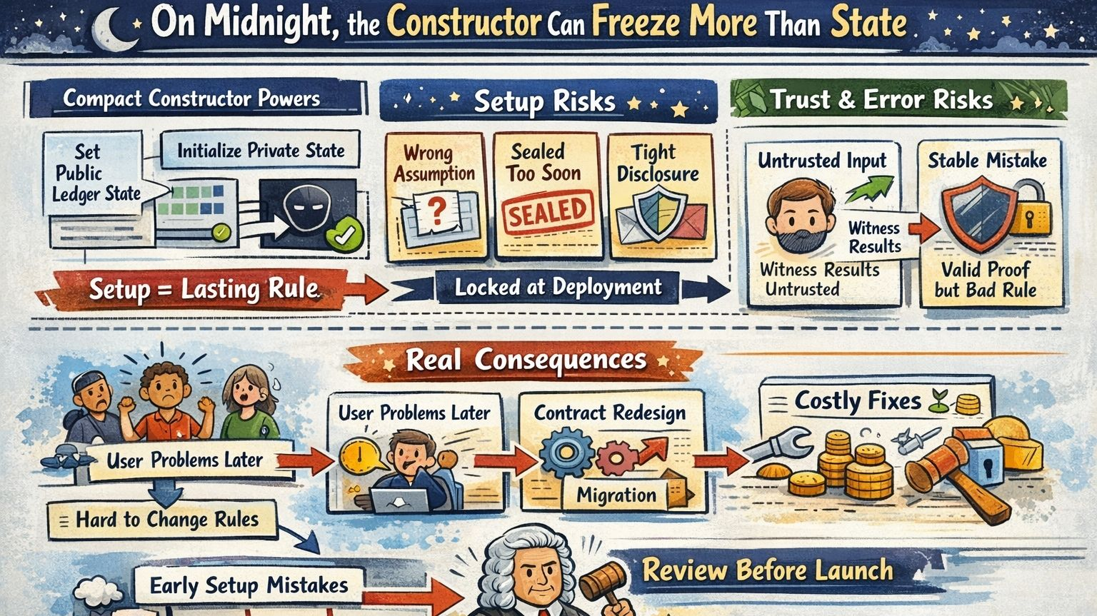 Imagine a builder using a constructor to set an initial disclosure boundary, a private-state default, or a sealed field that controls how some sensitive workflow begins. In testing, the assumption looks fine. The witness returns what the app expects. The deployment succeeds. Weeks later, real users arrive and the team realizes the workflow needed a different starting rule. Maybe a field should have stayed flexible longer. Maybe a visibility choice was too strict or too loose. Maybe a private-state assumption made sense in a lab but not in production. At that point the team is not just fixing a parameter. They may be staring at contract redesign, migration, or awkward compatibility work because the mistake lives in initialization, not just in later behavior.