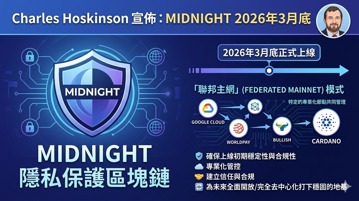 近日,Cardano 創辦人Charles Hoskinson正式宣佈隱私保護區塊鏈 Midnight將於2026 年 3 月底正式上線。而為了確保上線初期的穩定性與合規性,Midnight 採取了穩健的「聯邦主網」(Federated Mainnet)模式。